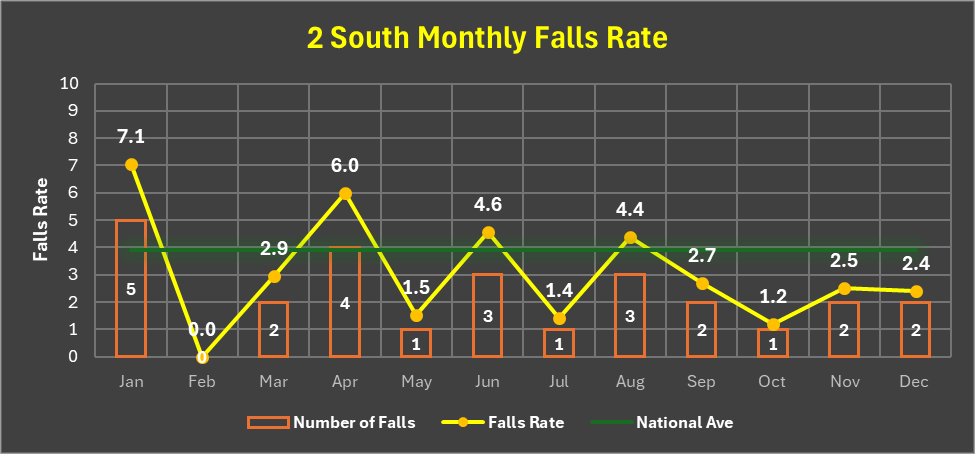 The 2025 WIG was a great success for South 2: their goal had been to bring their fall rate from 4.6 to 3.9 [falls rate = (Number of Falls/Total Patient Days) x 1000], but by the end of the year they had sailed all the way down to 3.0.