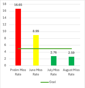 It took time to get to that team-wide shared understanding of the issues. But once they got there and started to use zero in on their WIG and use FHP Forward principles to close their quality gap, the results were dramatic. From a baseline ‘miss rate’ of 16.65 in May, the team dropped to 8.99 the very next month – and blasted past their <5% goal in July. In July and August the miss rate was down to 2.76 and 2.59.